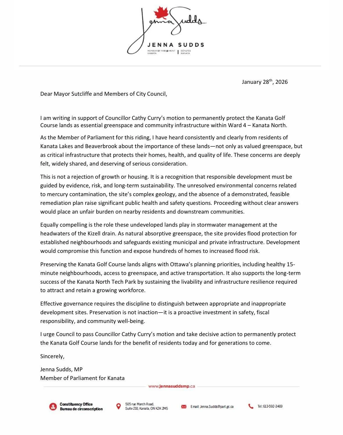 I will continue to support the works of Councillor Cathy Curry, and all of City Council as they oppose the development of the Kanata Lakes Golf Course. Thank you Cathy for your leadership. I stand with you.
